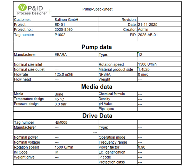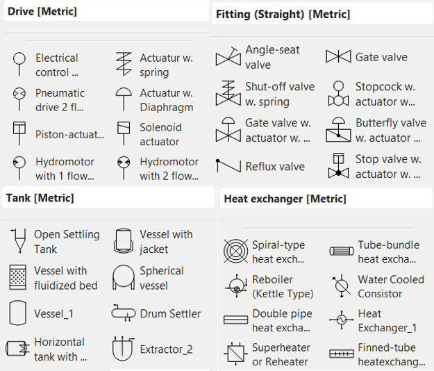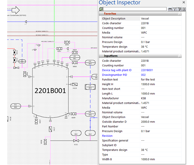 - All symbols and drawing elements have associated data properties (e.g. media, piping class, material, pressure, temperature)