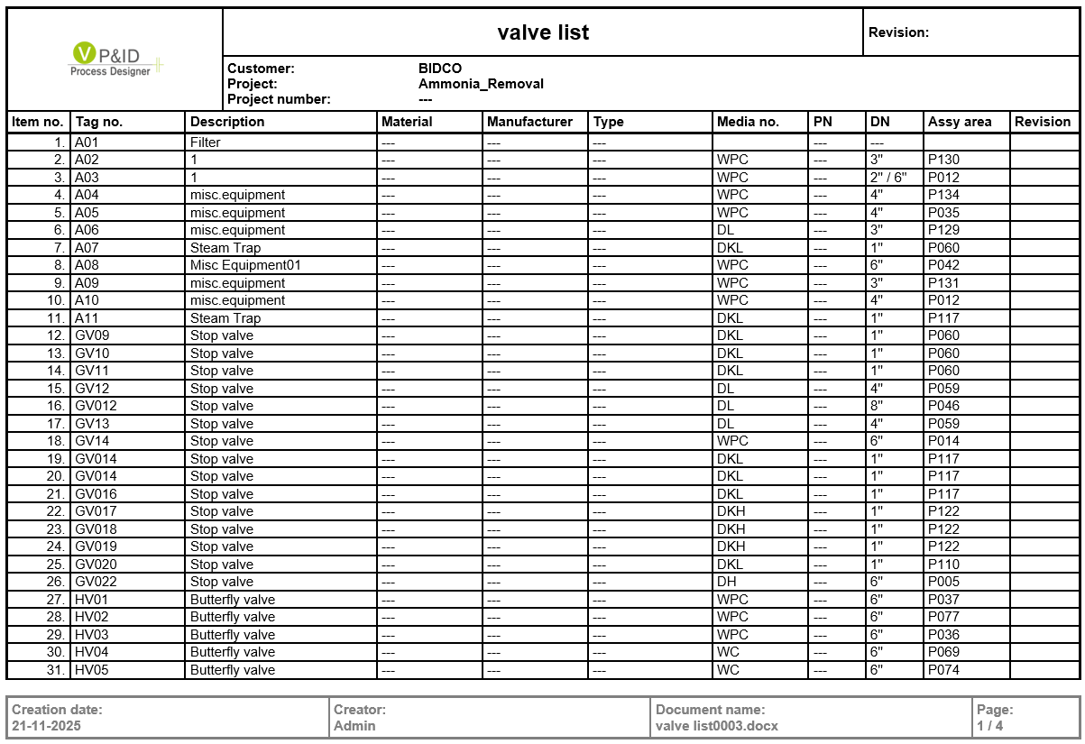 - Pre-defined reports (e.g. valve lists, equipment Lists, measurement lists, etc.) in excel or word and ability to define company wide formats